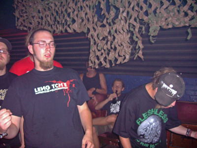 Bathtubshitter, Necromorph, Goregast19.07.2006 LIME-Club (Berlin)Na meine Damen und Herren, das war ein Package. Trotzdem will ich als erstes ein paar Dankeschön loswerden, an MAN Turbo, die mir die Zeit gegeben haben, diese Veranstaltung zu besuchen, an Wall Street Institut, in der Schönhauser Allee, die es mir ermöglicht haben, mit ihrem Unterricht, ein einigermaßen sinnvolles Gespräch in Englisch mit dem Frontmann von Bathtubshitters, Masato Morimoto, zu führen und natürlich an Jockel von Necromorph für die Einladung zu diesem Event. Schon der Soundcheck war ein Erlebnis für sich, es krachte ordentlich. Die Suche nach einem geeigneten Platz für die Kamera nahmen Lars, vom LIME, und mich trotzdem erst mal voll in Beschlag. Alles aufgebaut, konnte es ja losgehen. UND es ging die Post ab. Eröffnet wurde durch GOREGAST. „Du schmeckst“ knallte durch die Lokalität, na mein lieber Mann, die Jungs brauchen sich wirklich nicht verstecken. Eine phantastische Berliner Band, sympathisch obendrein. Nach „Solo Asesinos“, für die finsteren Seiten der menschlichen Natur, zogen GOREGAST den Titel „Varg Sucks Varg“ durch, eine gelungene Abrechnung mit einer Band, mit Fascho-Hintergrund, den Namen müssen wir hier nicht nennen. Ein bunter Reigen knallharter Musik, was GOREGAST zu bieten haben. Frontbrüller Rico nahm hin und wieder ein Bad in der Menge, und zog alle Sympathien des Publikums auf sich. Die Stimmung in der Gastlichkeit ist schon am Kochen, es sollte noch besser kommen, als NECROMORPH aus Berlin die Bühne erkletterten. Mit einem vollen Bretterknaller „Murder Victim“ eröffneten sie ihren Part. Brettmäßig legt sich der Musikteppich auf die anwesende Hörerschaft. Einfach mal Klasse. Und so ein netter Junge wohnte lange Zeit unerkannt in meiner Nachbarschaft. Und der Tanz ging weiter. Mit so herzhaften Kompositionen wie „Wallshitter“, „Inhale The Thrill“ und „Vandalist“ um dann mit Titeln von der neuen Scheibe, „Schwedische Tradition“, meinem Leib- und Magensong „Neurological Defizit“ und „Abort your Mind“ langsam zum Ende zu kommen. Tja liebe Leute, Falsch gedacht, Eine Zugabe wurde ja auch noch verlangt, die auch folgte mit zwei Covern, zum einen Carnage´s „Day Man Lost“ und Ulcerus Phlegm´s „Consequenz“. Dann erst ließ Auditorium die Jungs von der Bühne, bei den Temperaturen eine Befreiung. In diesem Sinne kann ich nur sagen, macht weiter so, liebe Leute, macht doch immer wieder Spaß. Den krönenden Abschluß dieses durch und durch gelungenen Abends machten BATHTUBSHITTER aus fernöstlichen Gegenden, genauer gesagt, die Herrschaften sind aus Japan an gereist, um dem deutschen Publikum zu beweisen, das man im guten alten Nippon auch gaaaaaanz anders kann, und mit welcher Vehemenz sie das unter Beweis stellten. „Fuck hip Raper“ wurde in die Lauschlappen reingedrückt, eine wahre Pracht. Masato tanzte auf der Bühne hin und her, ein Stehaufmännchen der Sonderklasse, spätestens nach dem zweiten Titel wäre ich herzinfarktreif gewesen. Unbeeindruckt von den tropischen Temperaturen zerrten BATHTUBSHITTER eine Show durch, einfach Klasse. Mein erster Eindruck von Masato war, oh ein japanischer Dani Filth, aber weit gefehlt. Sicher sind gewisse Ähnlichkeiten zu erkennen, aber das kleine sympathische Sprachrohr (Kreisch- und Brüll- und Growlrohr ist wahrscheinlich der bessere Ausdruck) seiner Band kann einfach mehr. Das Auditorium war begeistert, war die Stimmung bis dahin geil, jetzt flippten die Leute aus. Was GOREGAST und NECROMORPH vorbereitet haben, ernteten die quirligen Japaner jetzt mit vollen Händen. Der menschliche Inhalt des LIME lag Masato und Mannen förmlich zu Füßen, Fakt ist, unsere japanischen Gäste haben es, ein paar Tage nach der WM, überzeugend geschafft, zu zeigen, es gibt mehr als Fußball und es muß nicht immer eine renommierte Band sein, um einen stimmungsvollen Abend zu erleben, was auch den vorhergehenden Parts zum Kompliment gereicht sei. (MRD) |